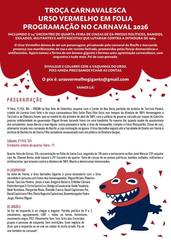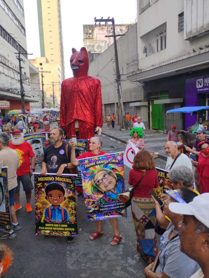 Troça carnavalesca «Urso Vermelho em folia» fez ensaio pré-carnavalesco na rua 7 de setembro e Conde da Boa Vista, lembrando as vítimas da ditadura militar no país.