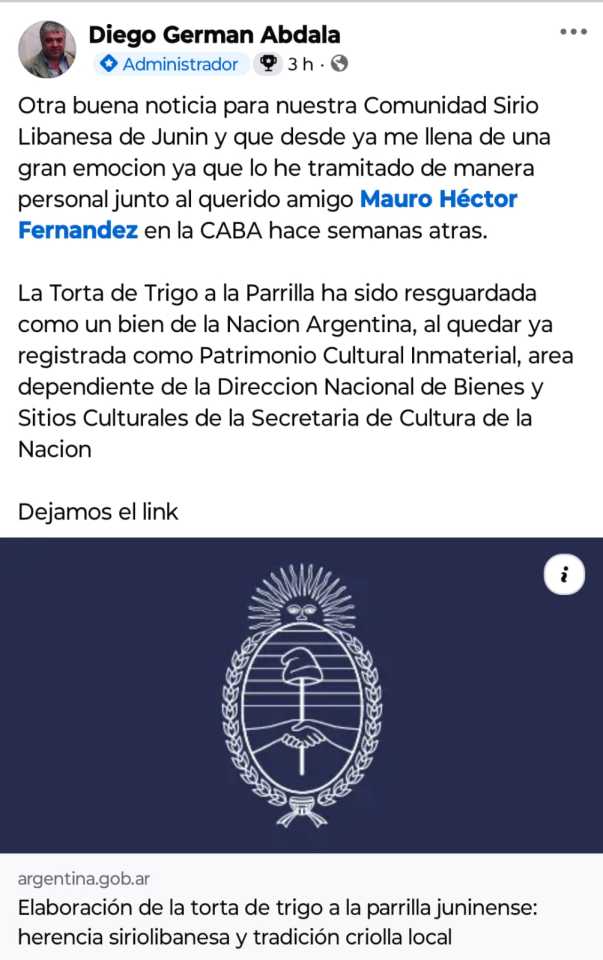 La comunidad sirio-libanesa de Junín celebra una importante noticia: la tradicional torta de trigo a la parrilla ha sido oficialmente reconocida como Patrimonio Cultural Inmaterial de la República Argentina.